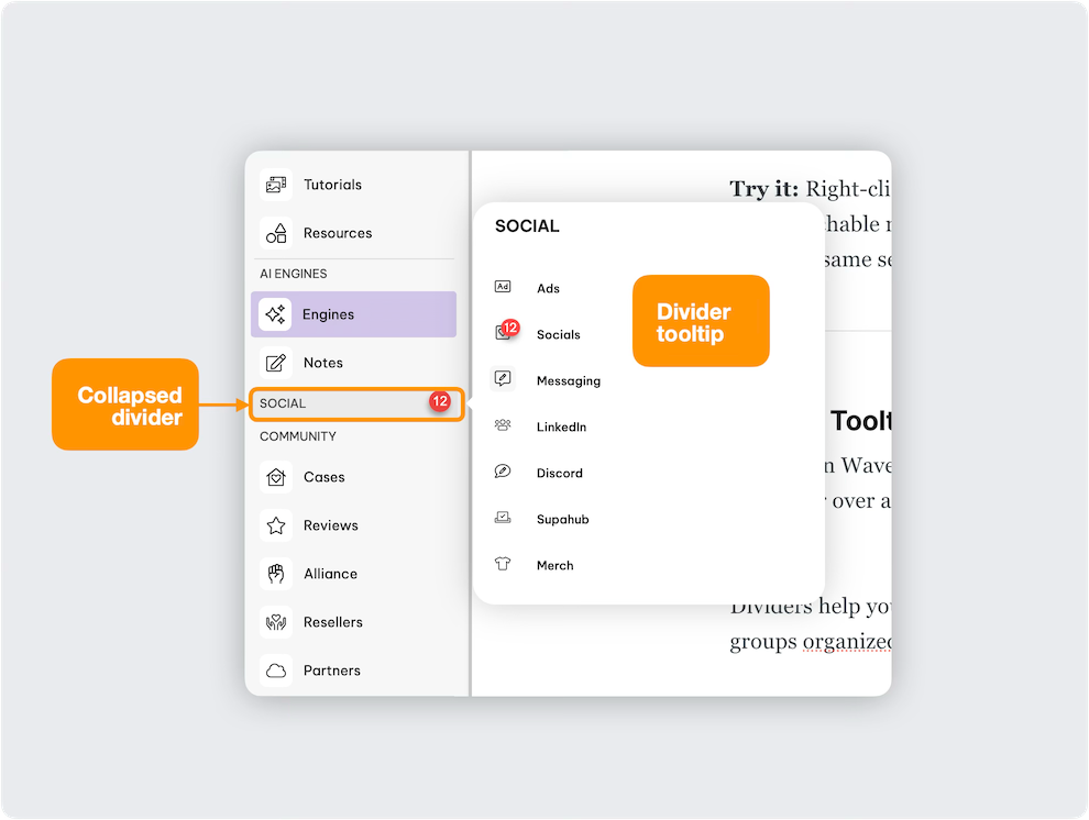 Think of them like the plastic divider bars at a supermarket checkout – they visually separate items but don't hold anything themselves. In Wavebox, this means a divider is not a folder or container; it’s purely a visual separator and has no effect on your accounts or cookie profiles. The main purpose of dividers is to tidy up your sidebar and even allow you to collapse groups under them, giving you more space and helping you stay focused by hiding those groups until needed.