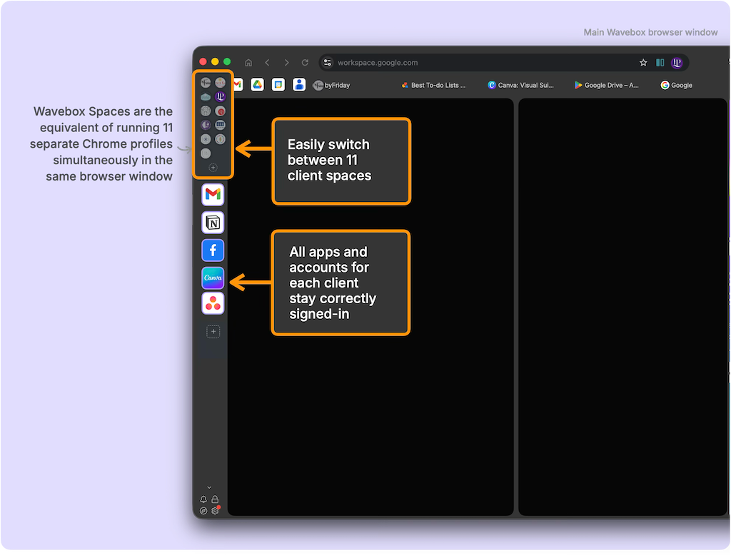The approach was straightforward — create a Space in Wavebox for each client. Think of Spaces like separate chrome profiles, or browsers that all live inside one window. Each one keeps its own logins and cookies completely walled off, so there's zero chance of mixing up accounts.