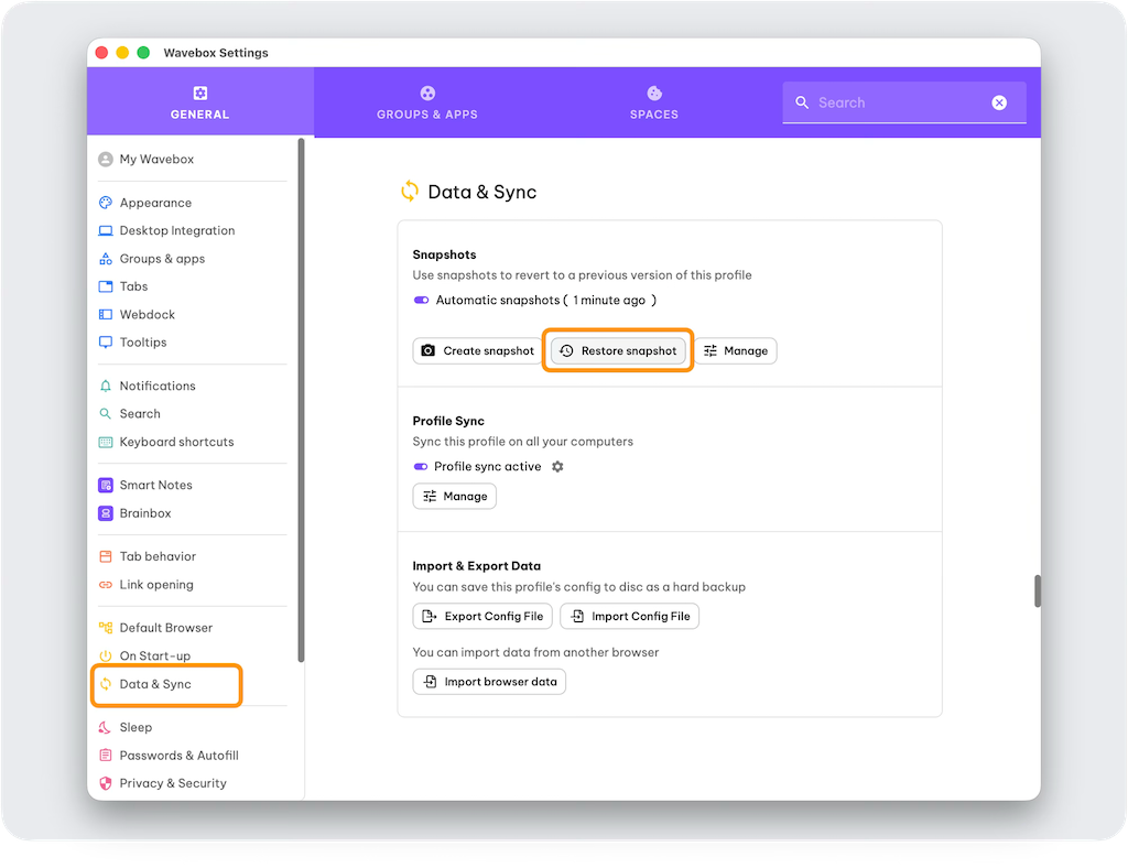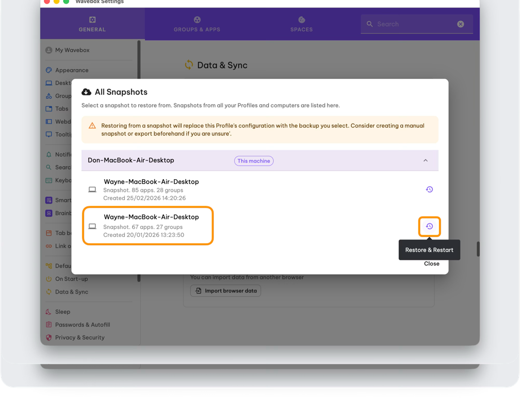 Snapshots give you a quick, secure way to roll back your Wavebox Profiles to a previous version. To restore: Settings > General > Data & Sync > Snapshots → pick a timestamp → confirm → Wavebox restarts.