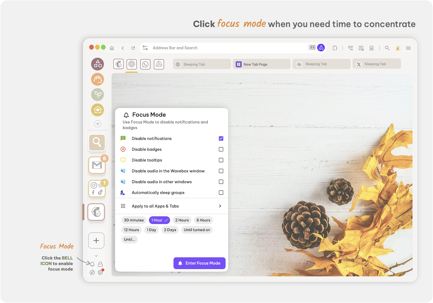 Wavebox has Focus Mode built-in. With one click, you can temporarily mute notifications, hide unread badges, silence audio, and even put apps to sleep. You can apply Focus Mode to everything, or use custom Zones to mute only specific groups—like silencing social media during work hours while keeping client communications active.