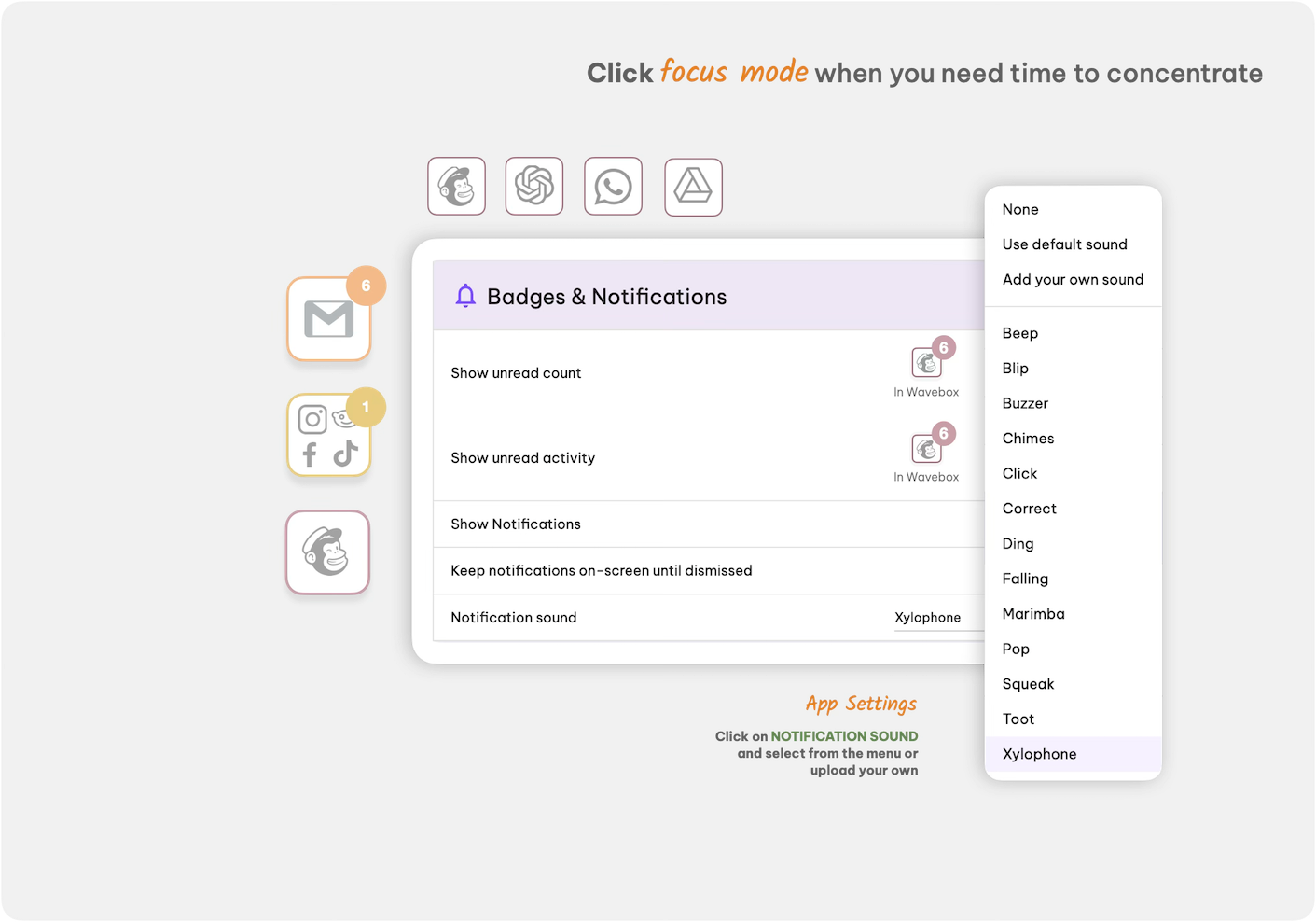 Instead of hearing the same generic "ding" for every notification, Wavebox lets you assign different sounds to different apps. A gentle "harp" for Gmail, a soothing "chime" for Slack—you'll instantly know what needs your attention without even looking at the screen.