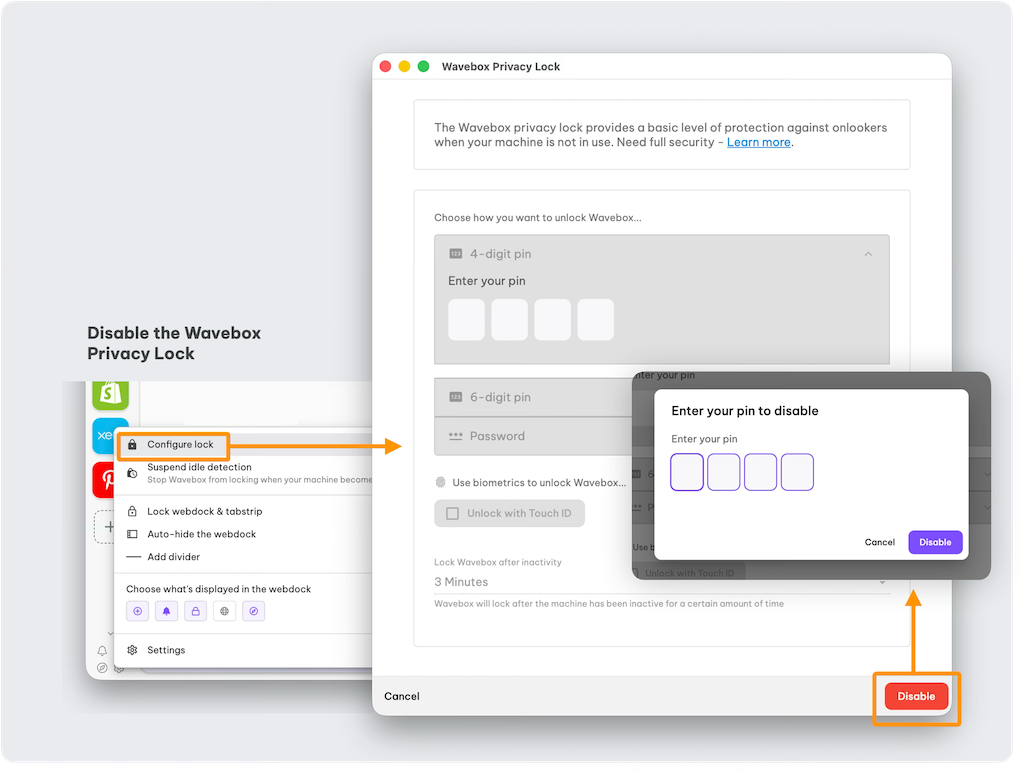 Privacy Lock prevents others from seeing your open apps and tabs in Wavebox when you are away from your desk. When enabled, it hides everything behind a PIN, password, or biometric login (e.g., Touch ID/Windows Hello).