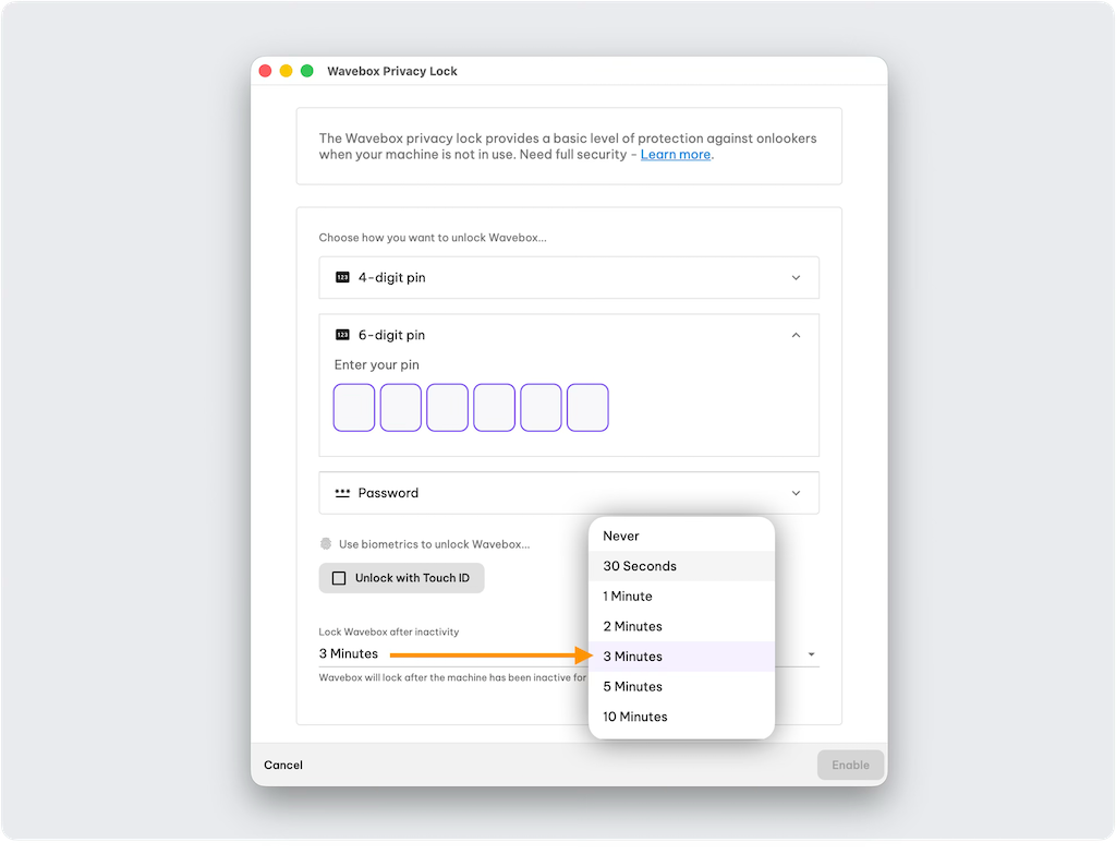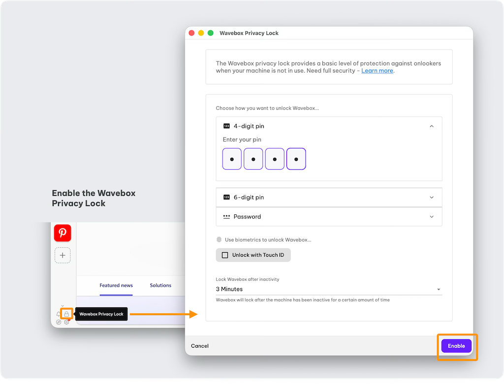 - Click 'Enable' to save your Settings. Wavebox is now protected by Privacy Lock.