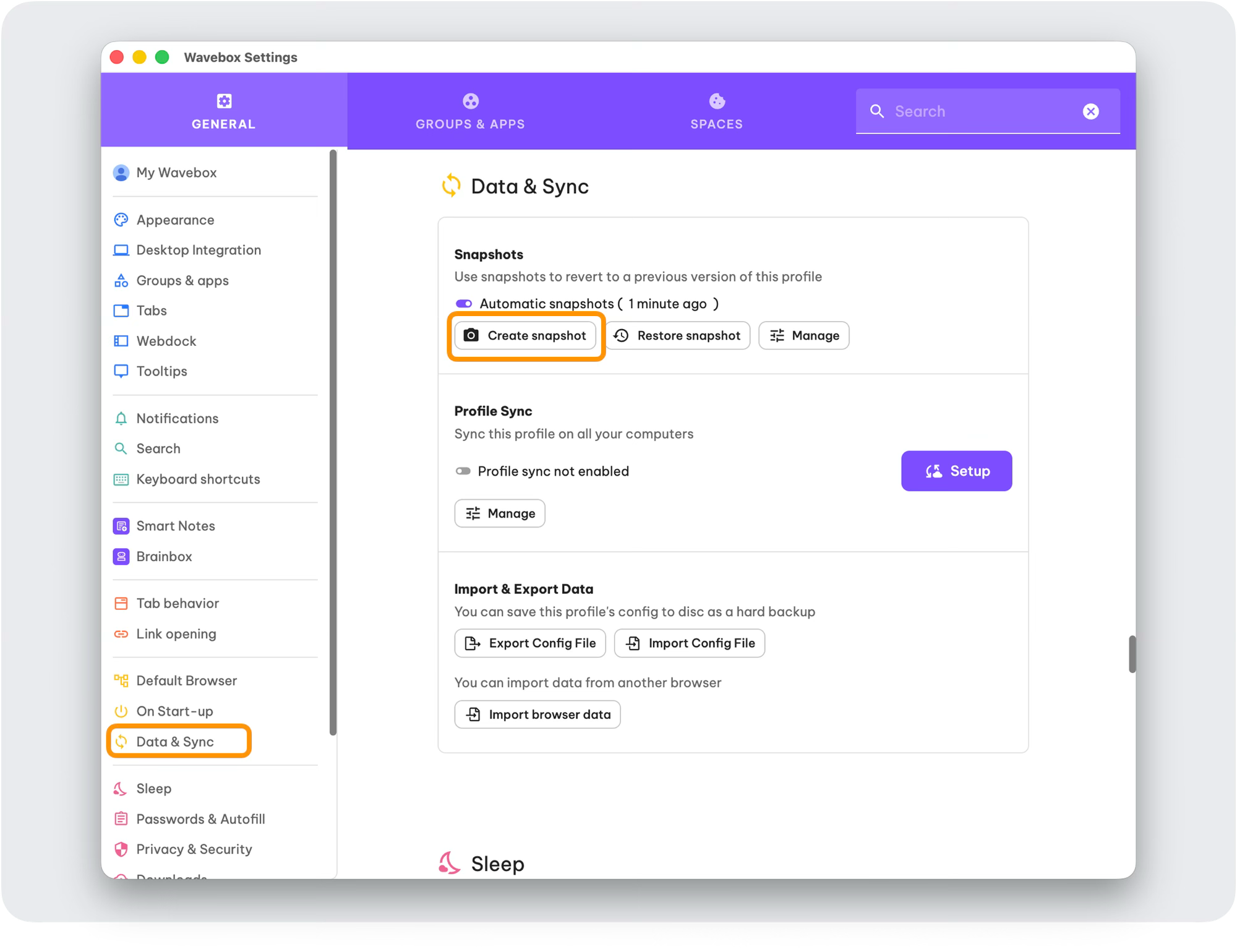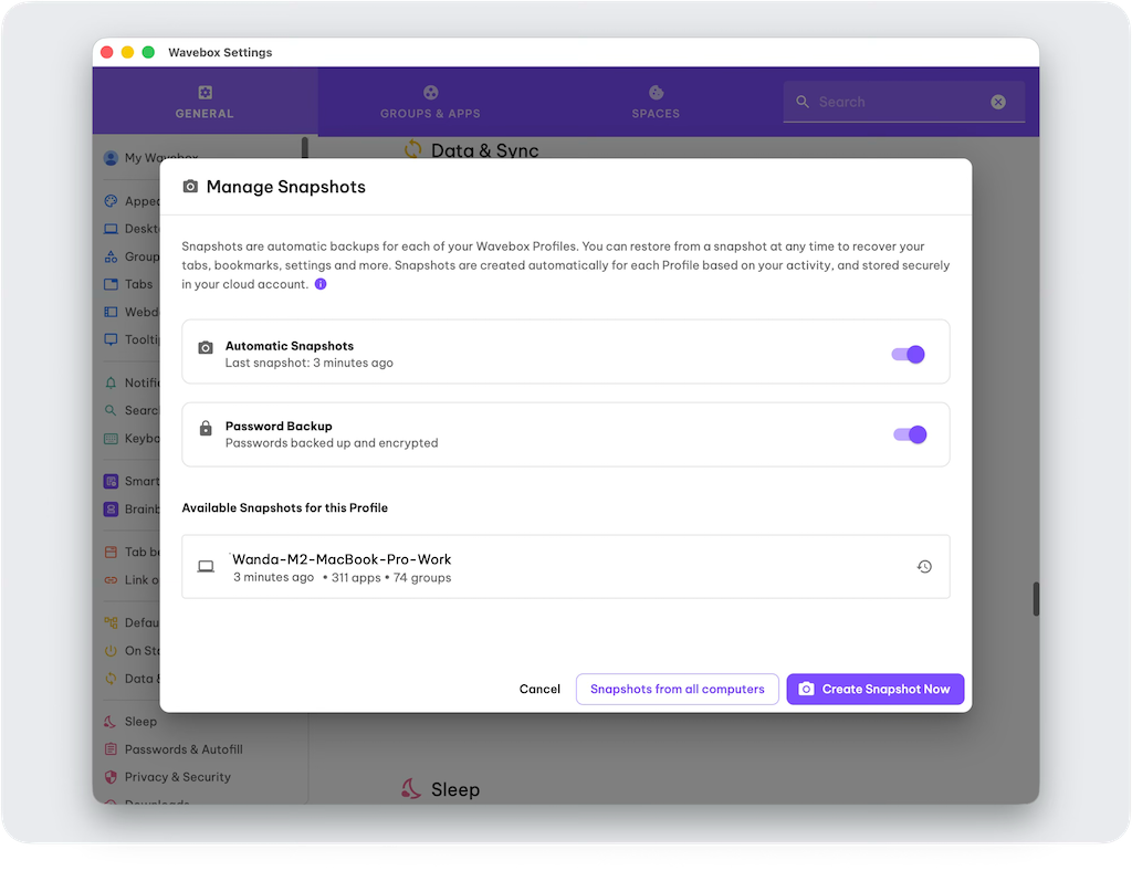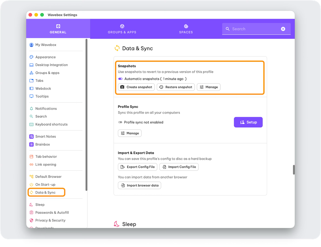 You can restore a Profile from a Snapshot at any time to recover groups, apps, tabs, bookmarks, settings etc. Snapshots can also be used to setup Wavebox on another computer.
