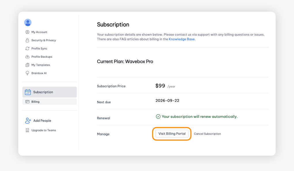 Individual and team subscriptions are managed through the My Wavebox Admin Portal, which can be accessed via the app. For subscription and billing enquiries, please email support.