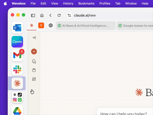 Click and drag icons to reorder them or move them between dividers. Wavebox keeps each app in its original Space container, even when displayed together.