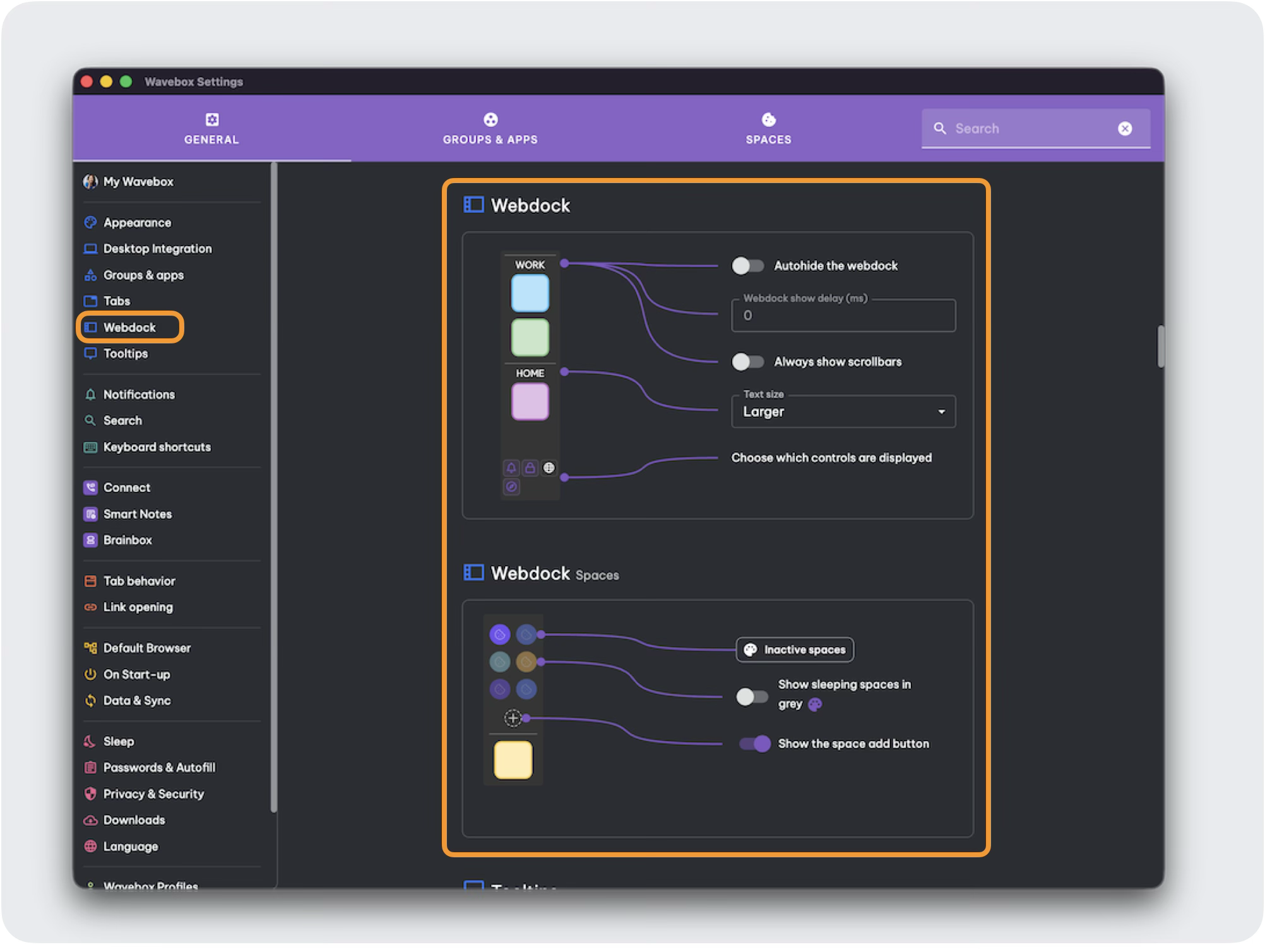- Spaces Add (+) icon - Hide the Spaces + icon under âš™ Settings > General > Webdock > Spaces > Show the Space Add Button > Toggle ON or OFF.