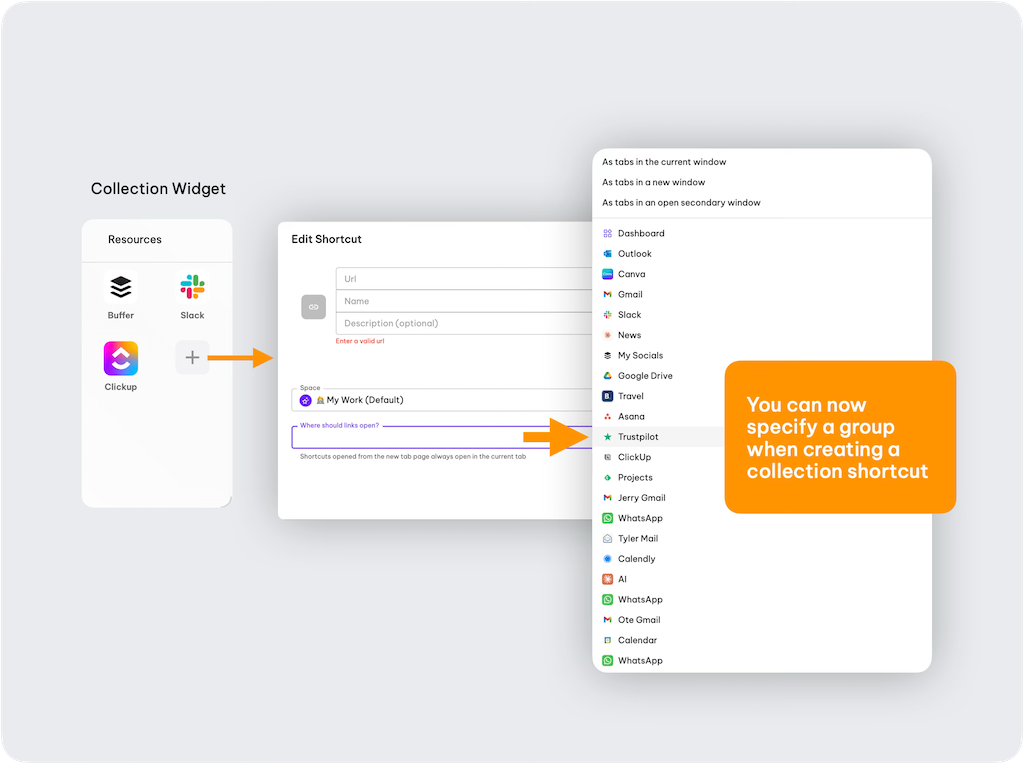 You may come across pages/URLs you want to add to a Collection as you work. It could be a website, a document on Google Drive, or a project in ClickUp. When these pages have very long links, it's easier to 'send' them to a Collection than add them manually. Here's how: